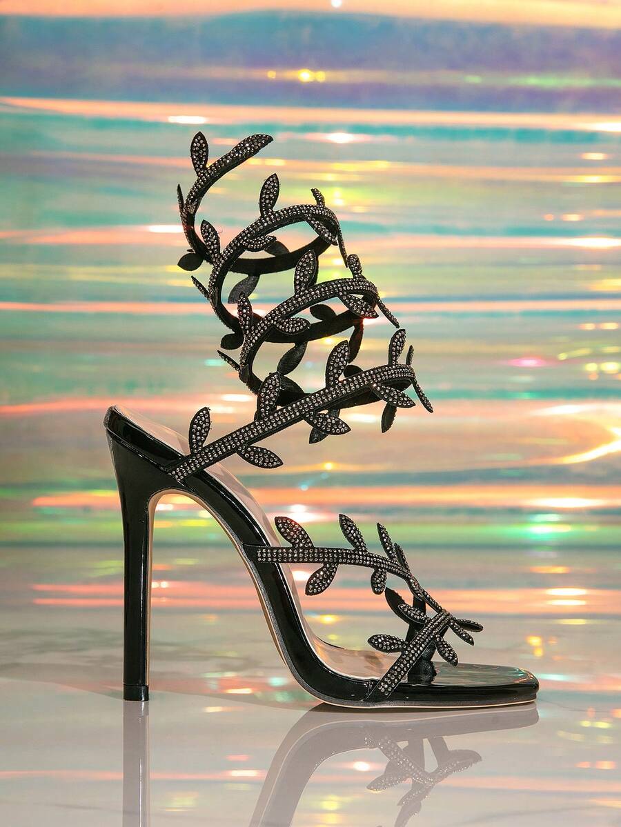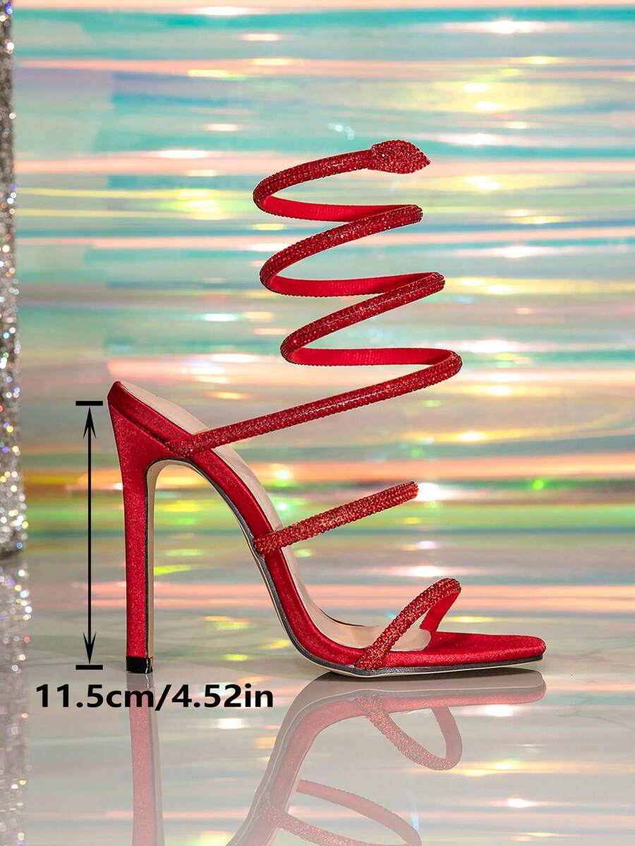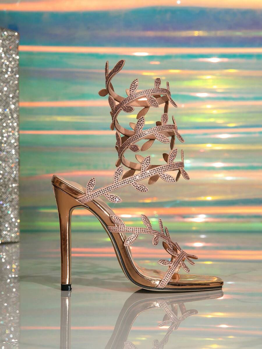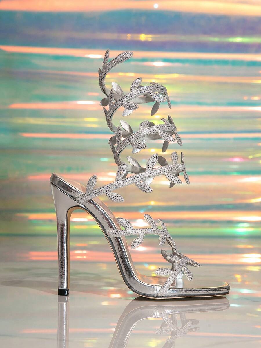 Elegant Women's High Heel Shoes, Fashion Sexy Super High Heel Ladies Sandals With Leaf Decor, Suitable For Banquet, Party, Rhinestone Snake-Wrapped Roman Sandals