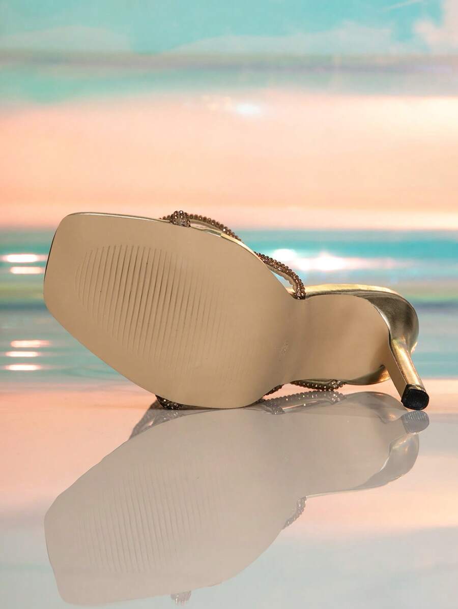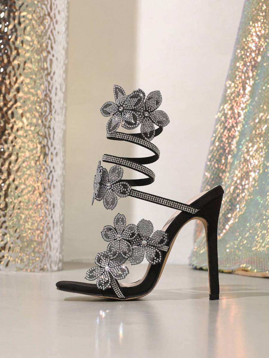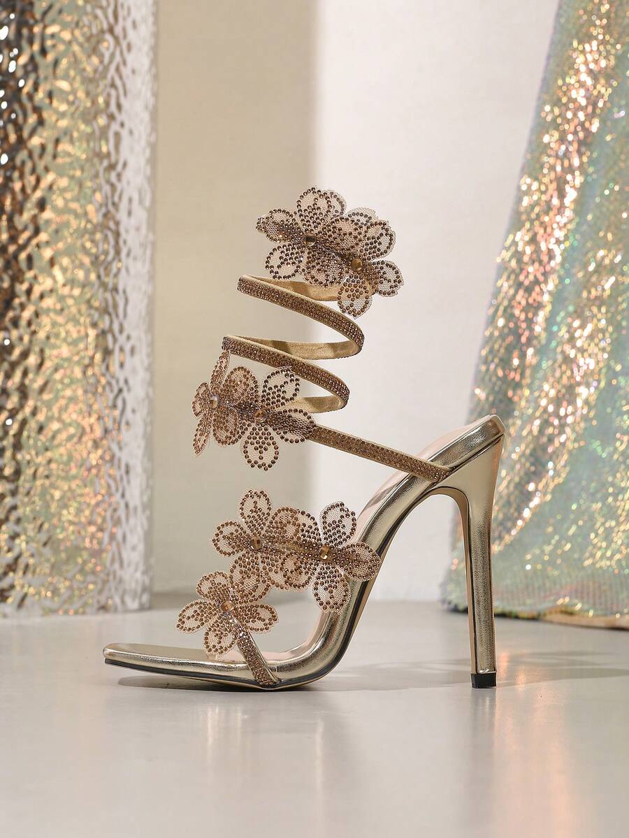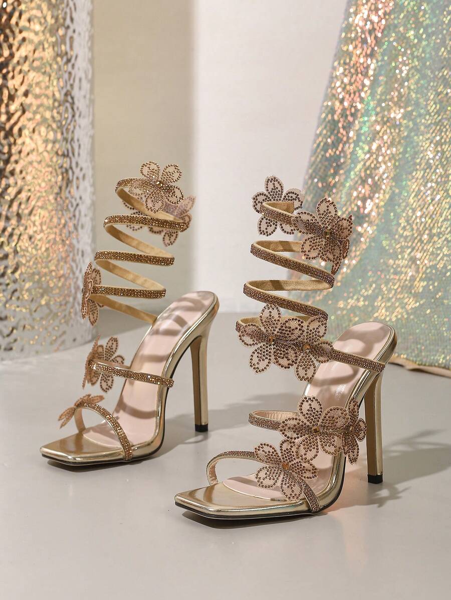 Elegant Women's High Heel Shoes, Fashion Sexy Super High Heel Ladies Sandals With Leaf Decor, Suitable For Banquet, Party, Rhinestone Snake-Wrapped Roman Sandals