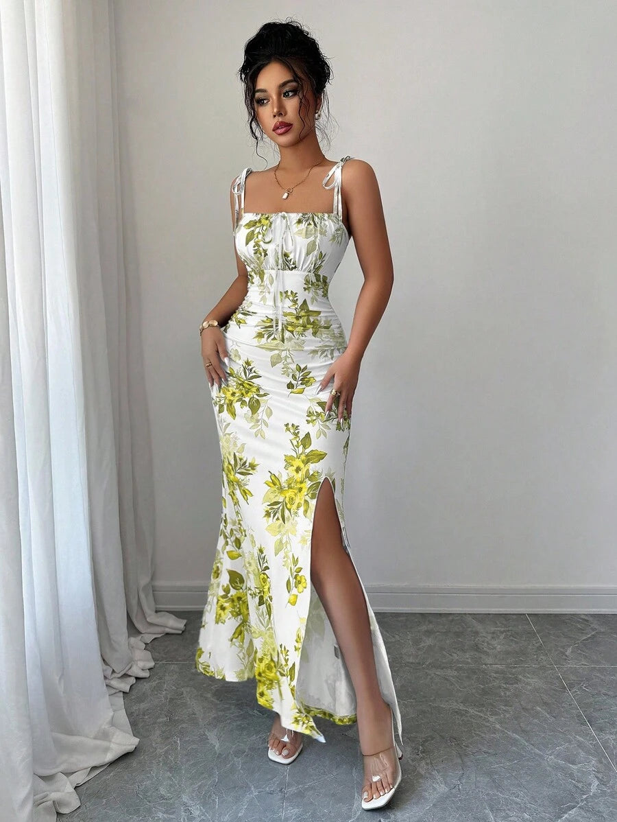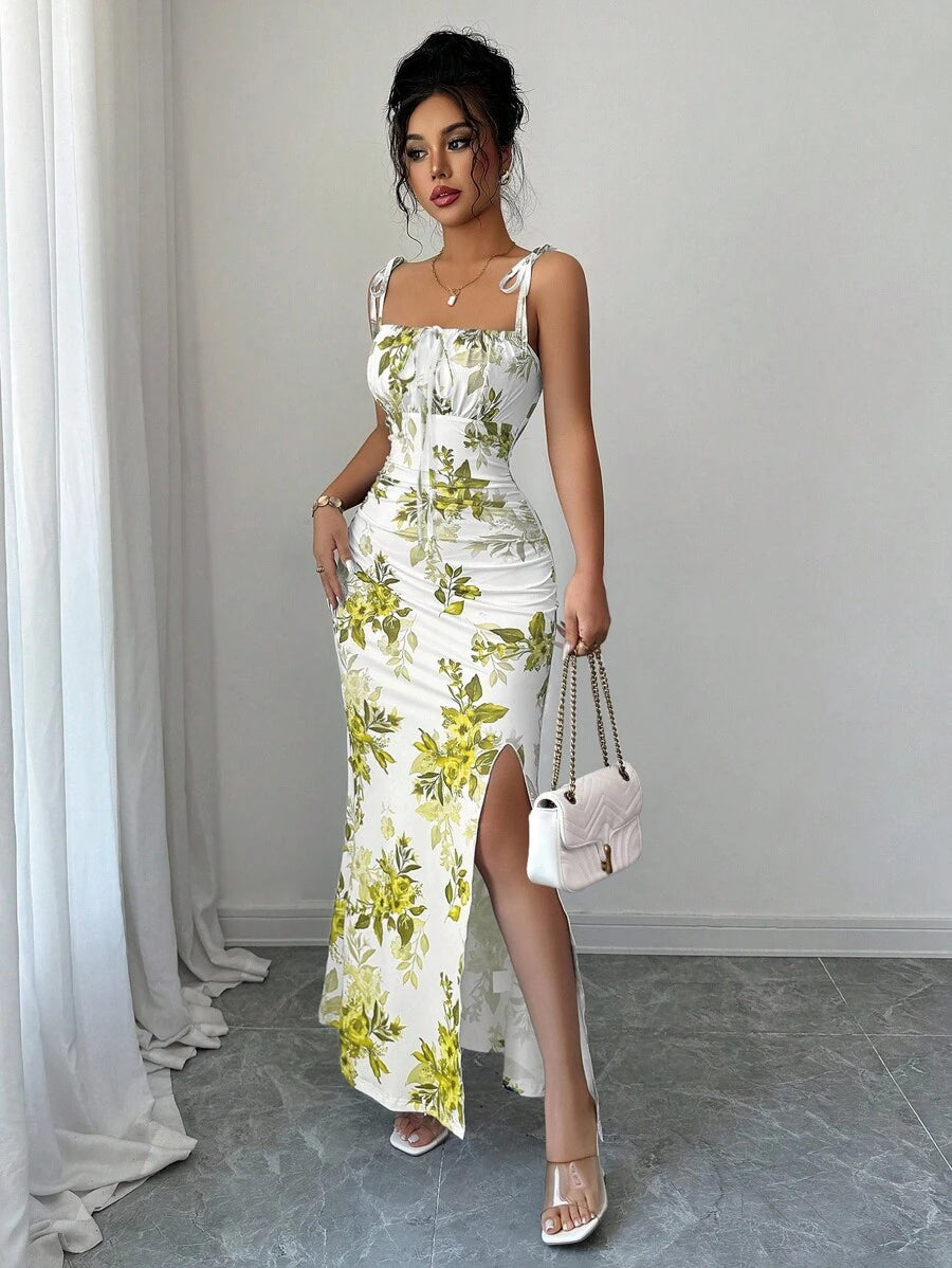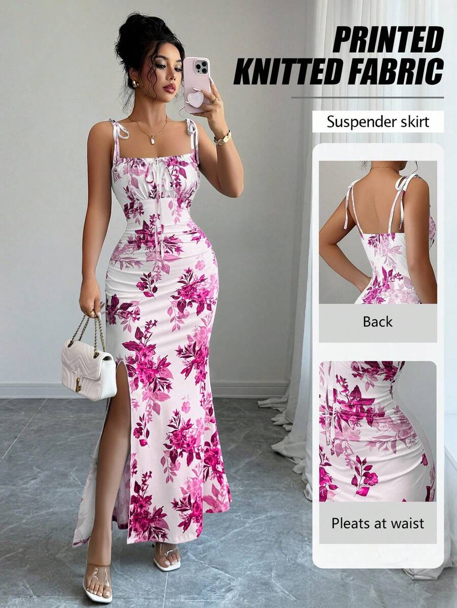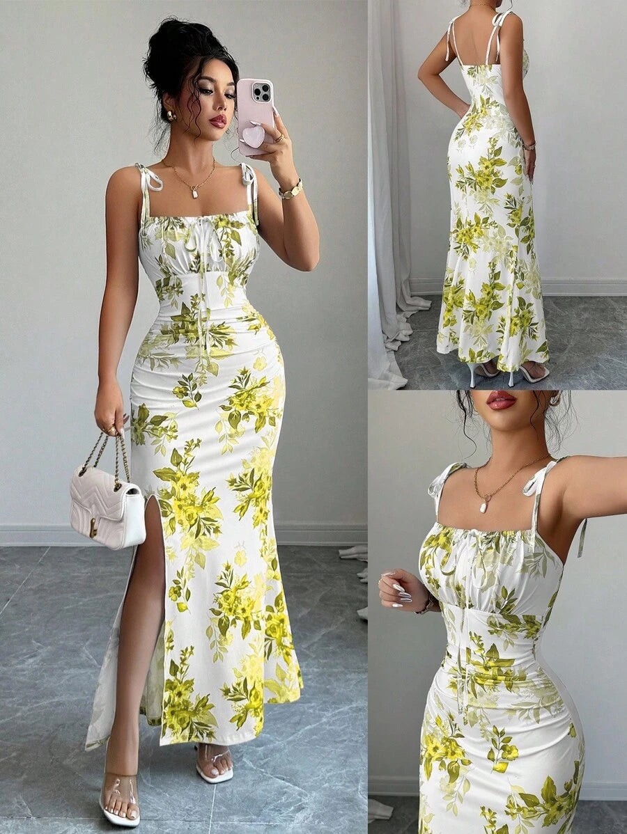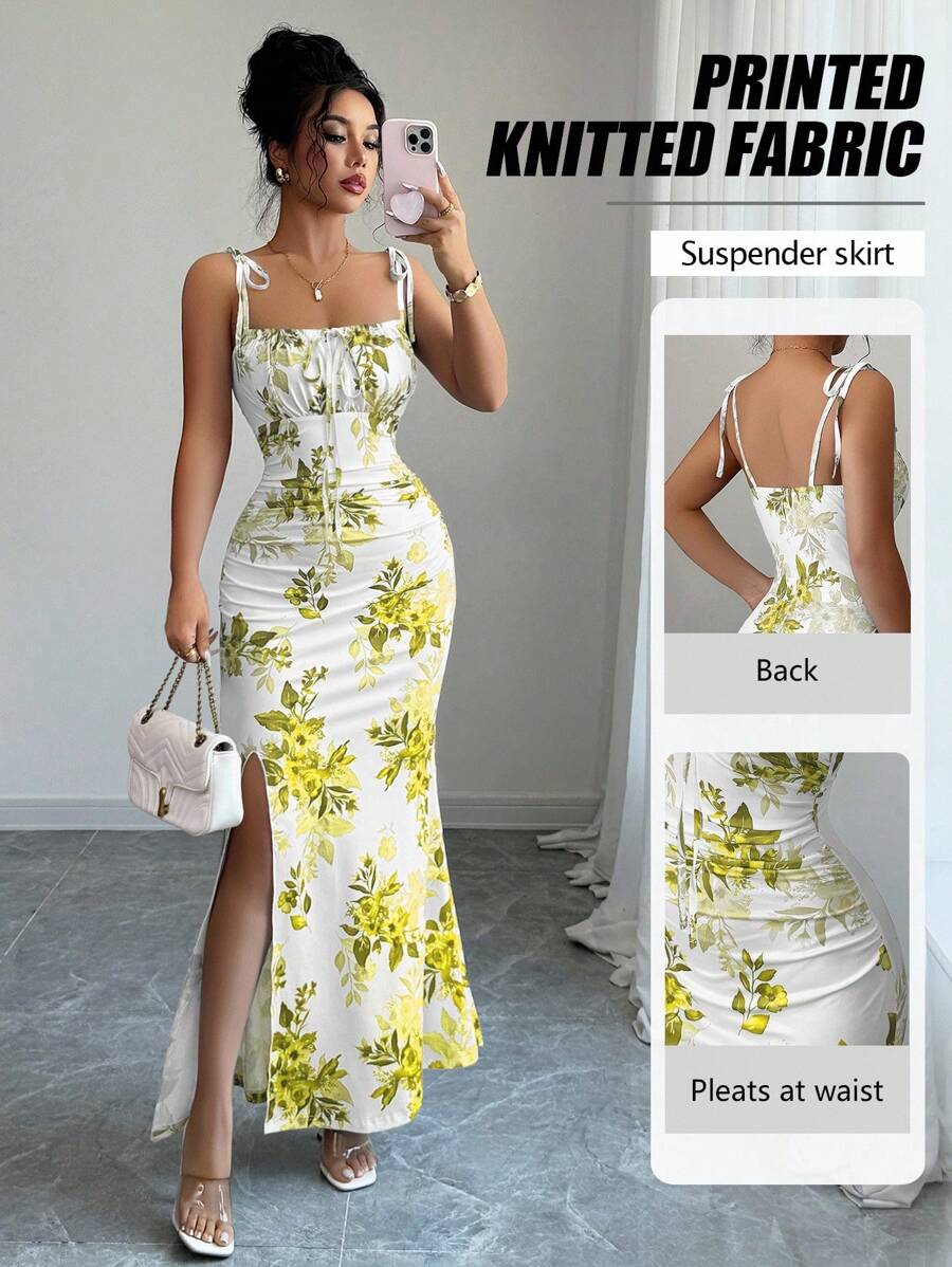 Elenzga New Women's Spaghetti Strap Tie Bow Waist Ruffle Hem Slit Design Dress, Versatile For Dates, Parties, Daily Wear, Flattering & Elegant