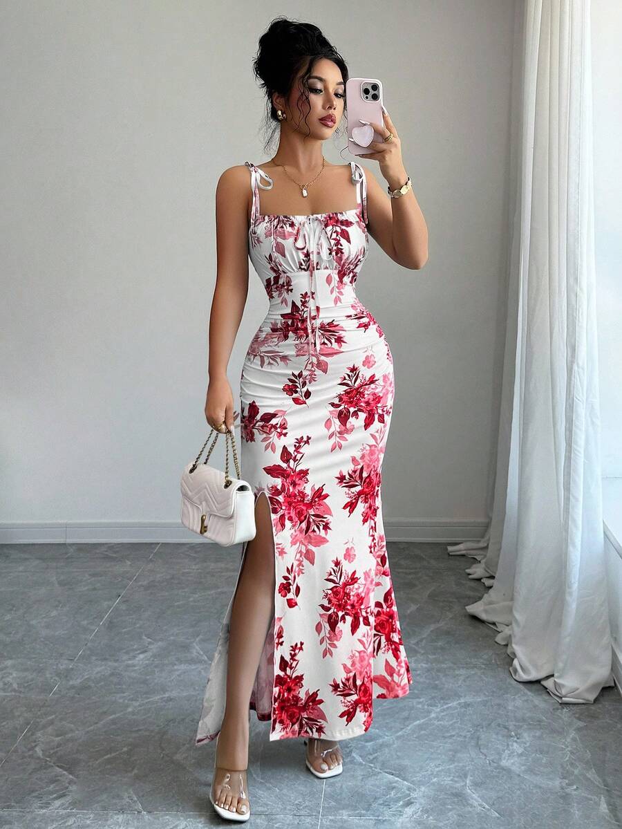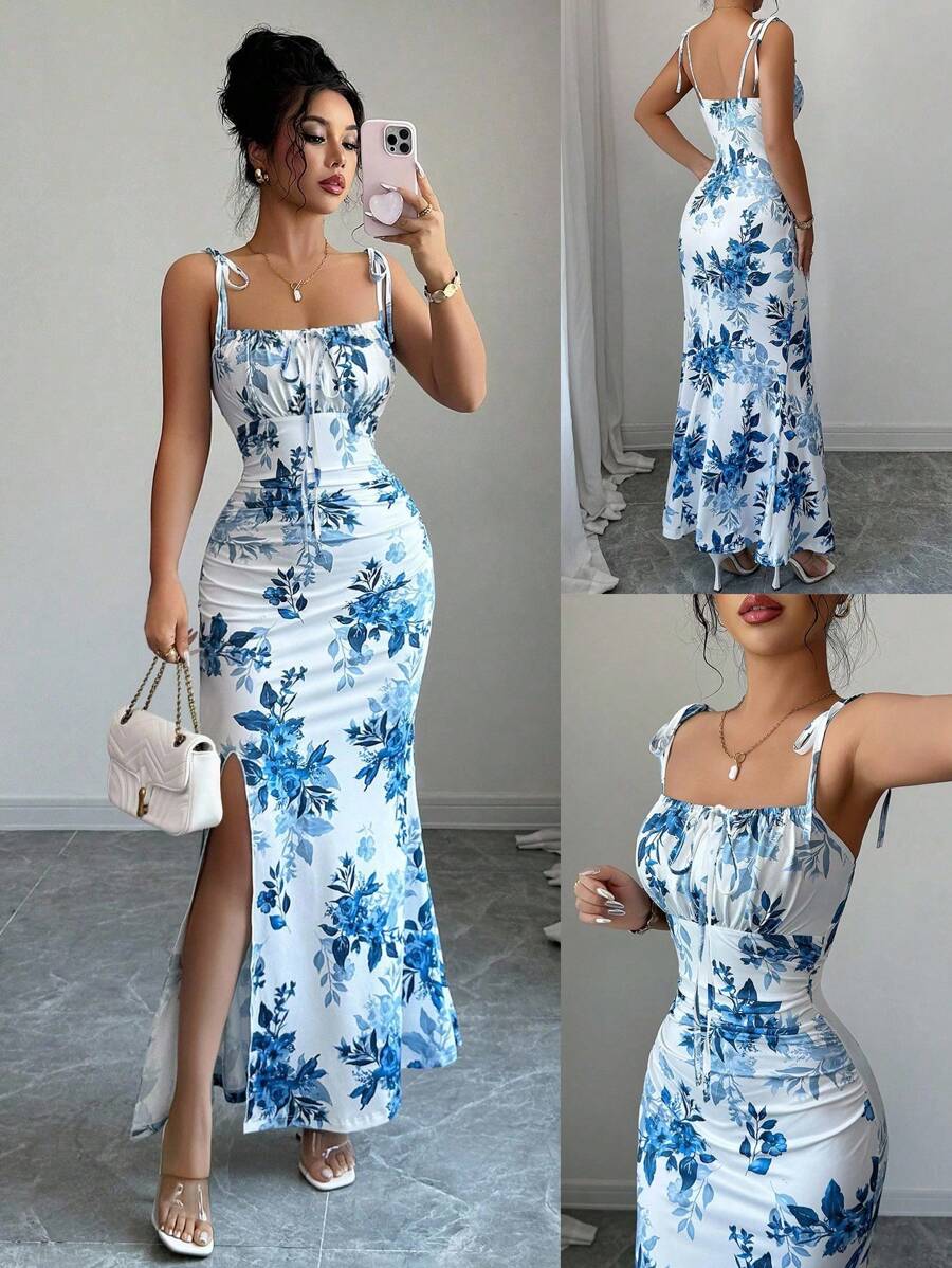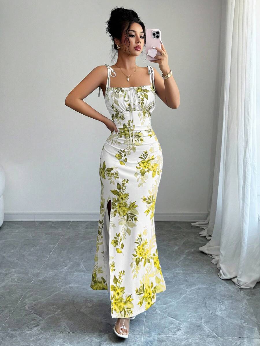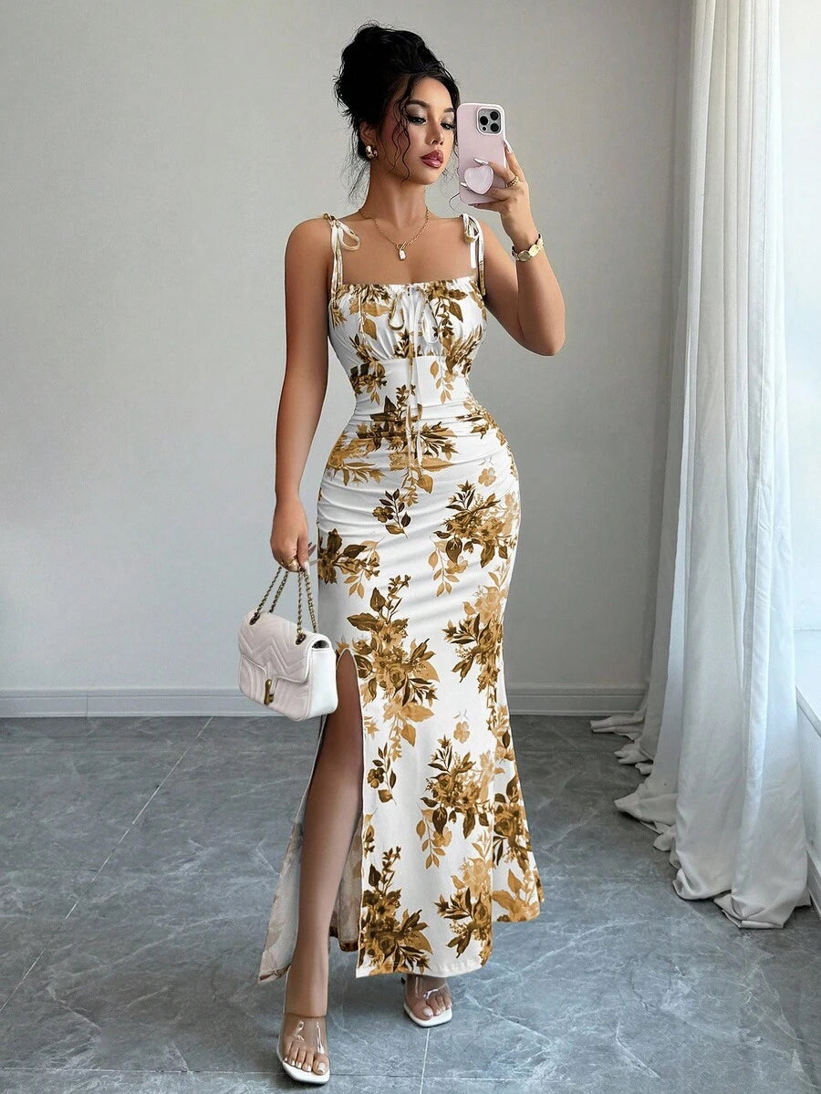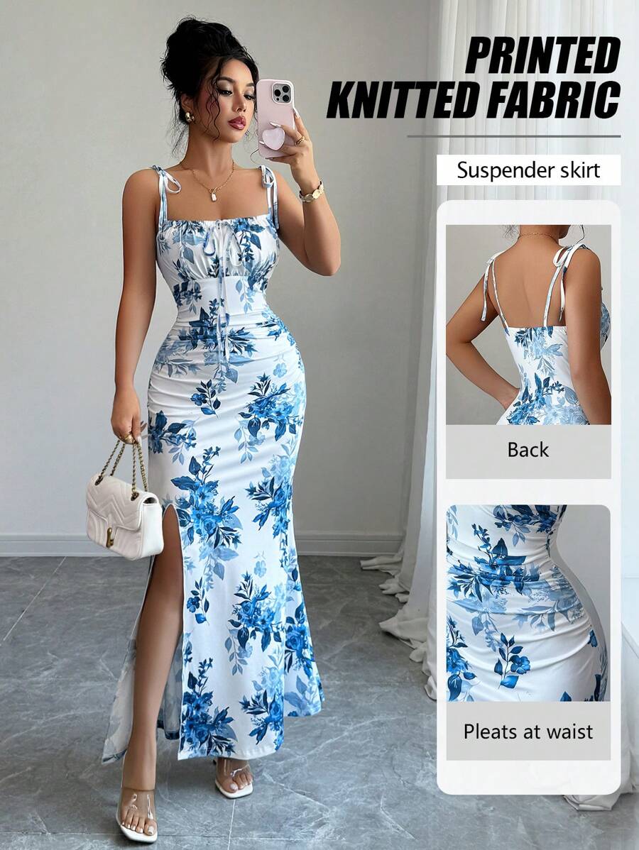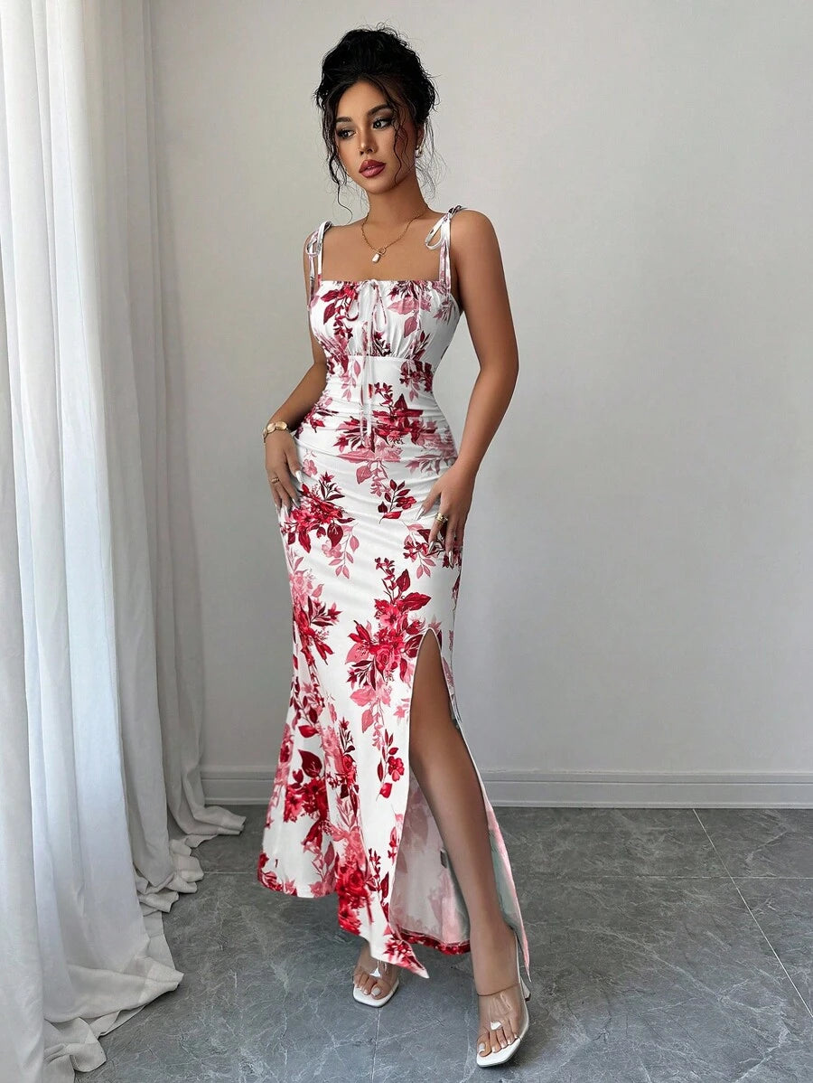 Elenzga New Women's Spaghetti Strap Tie Bow Waist Ruffle Hem Slit Design Dress, Versatile For Dates, Parties, Daily Wear, Flattering & Elegant