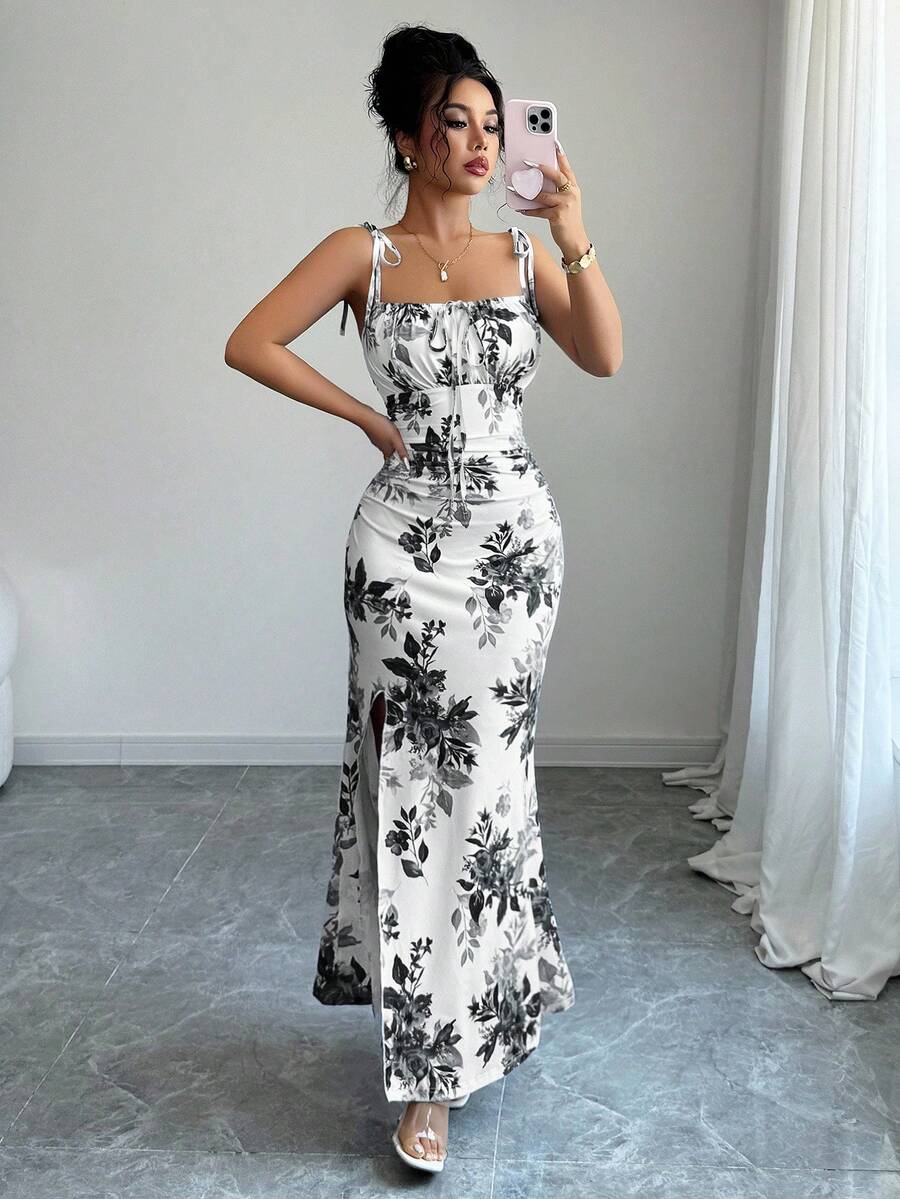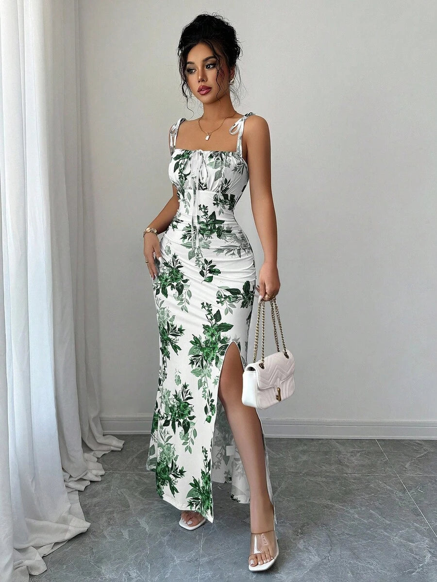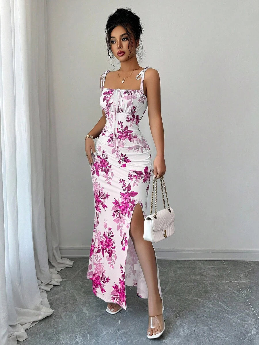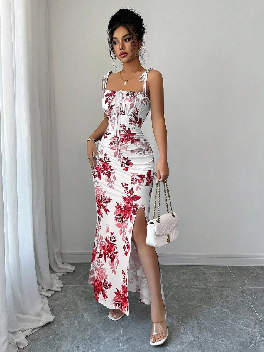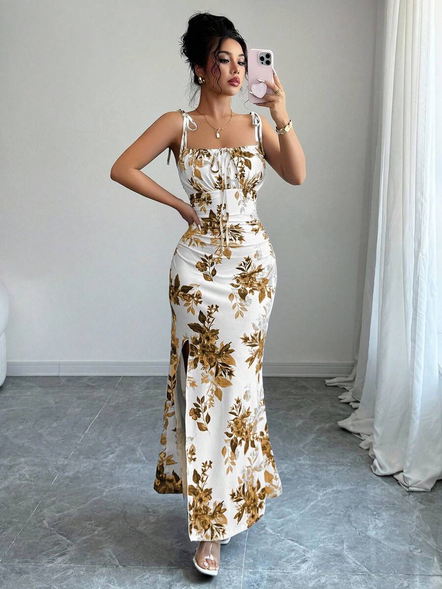 Elenzga New Women's Spaghetti Strap Tie Bow Waist Ruffle Hem Slit Design Dress, Versatile For Dates, Parties, Daily Wear, Flattering & Elegant