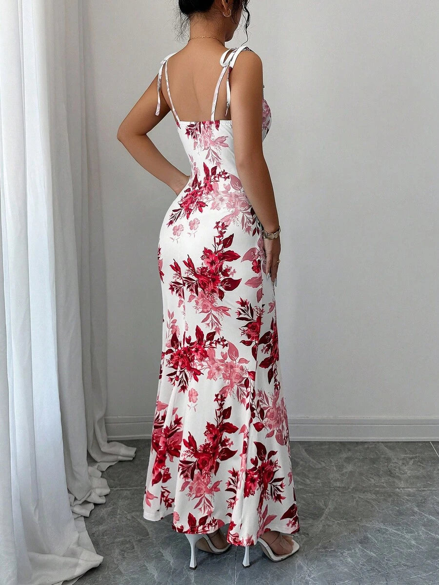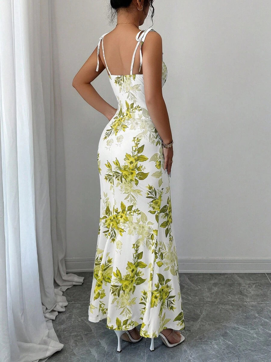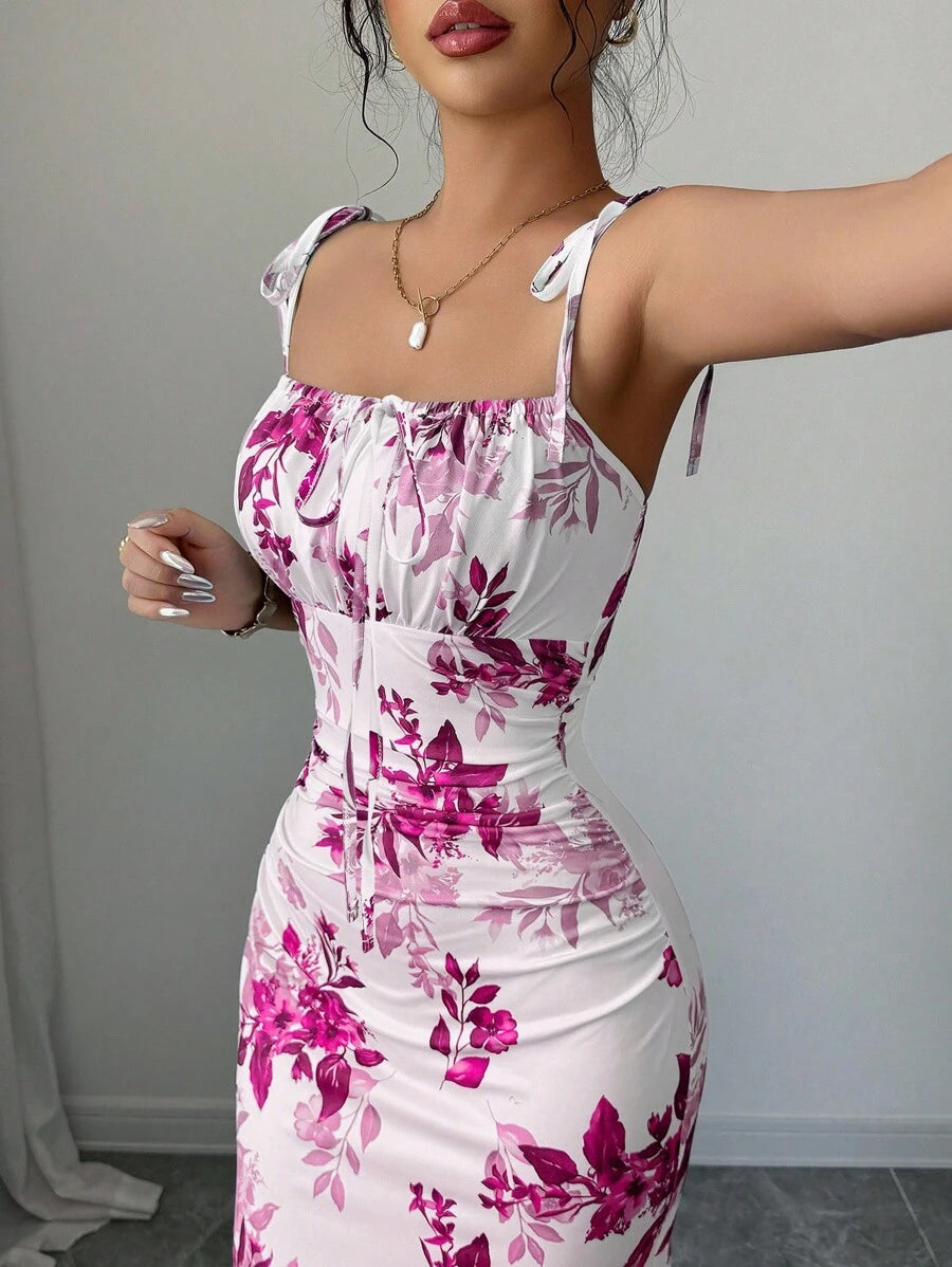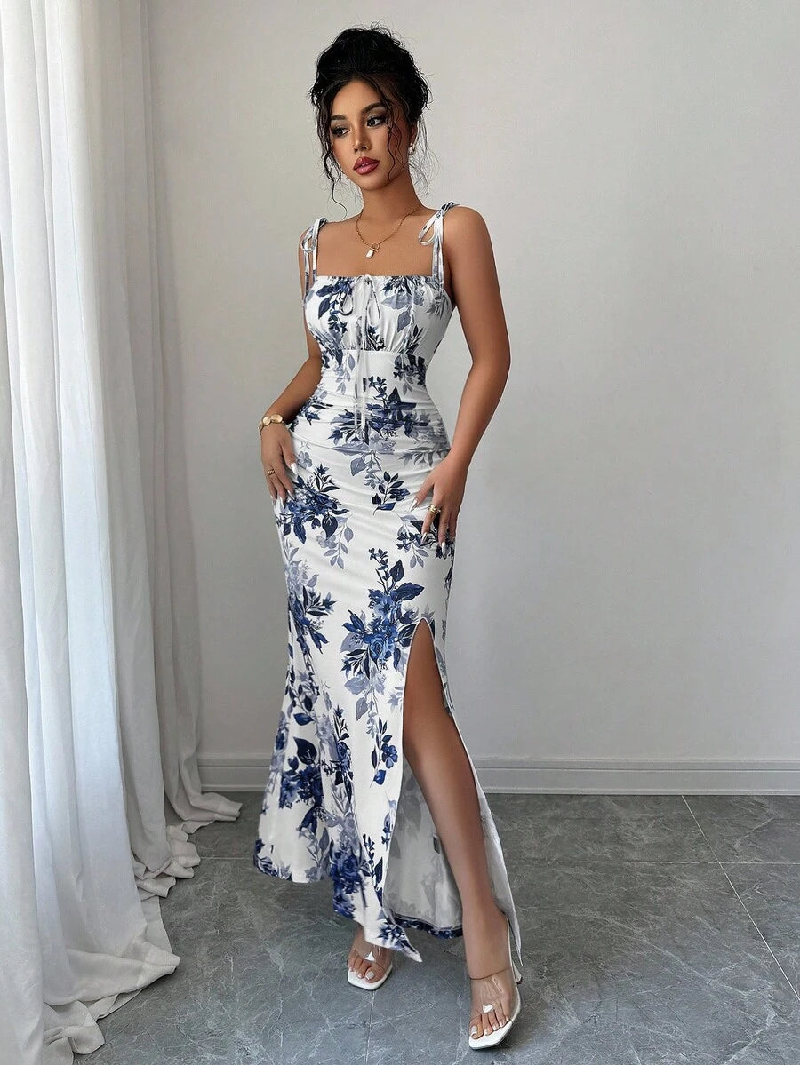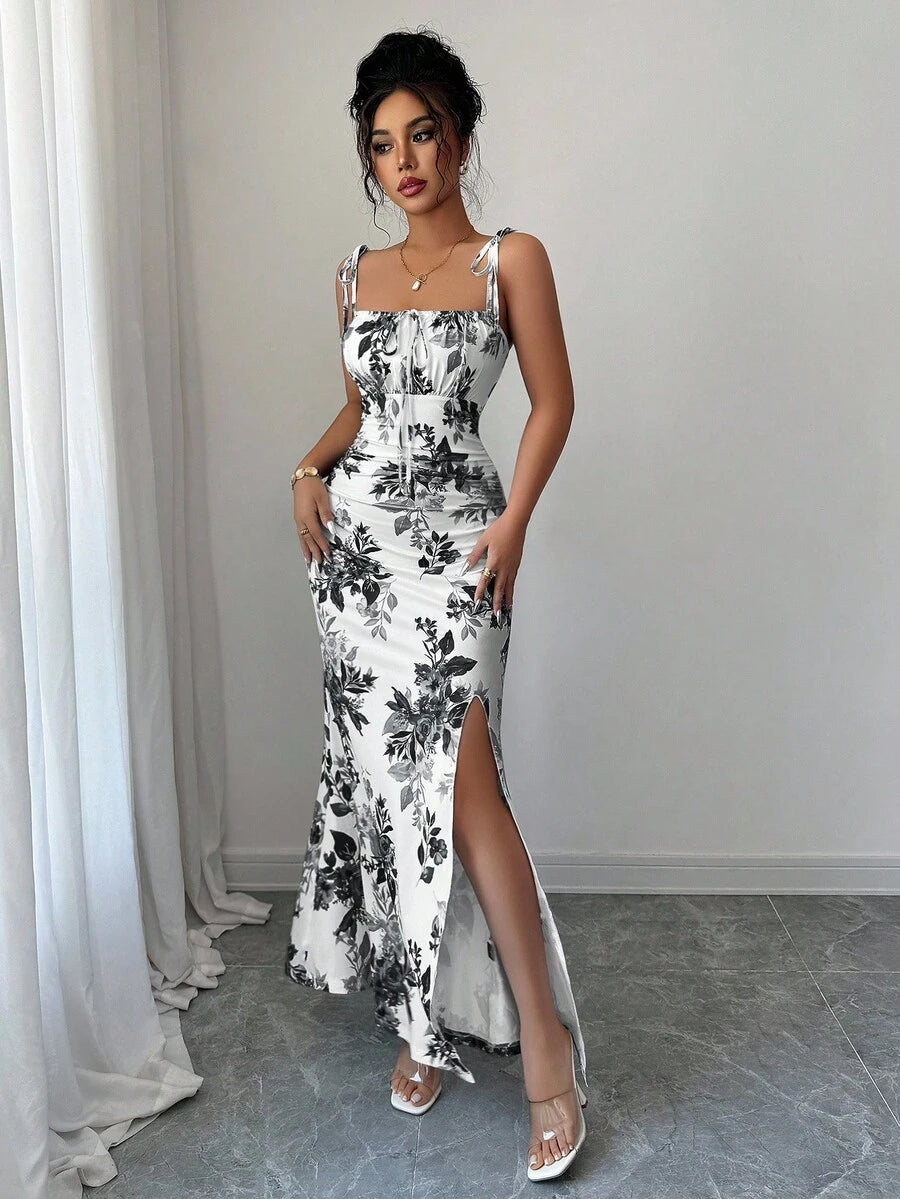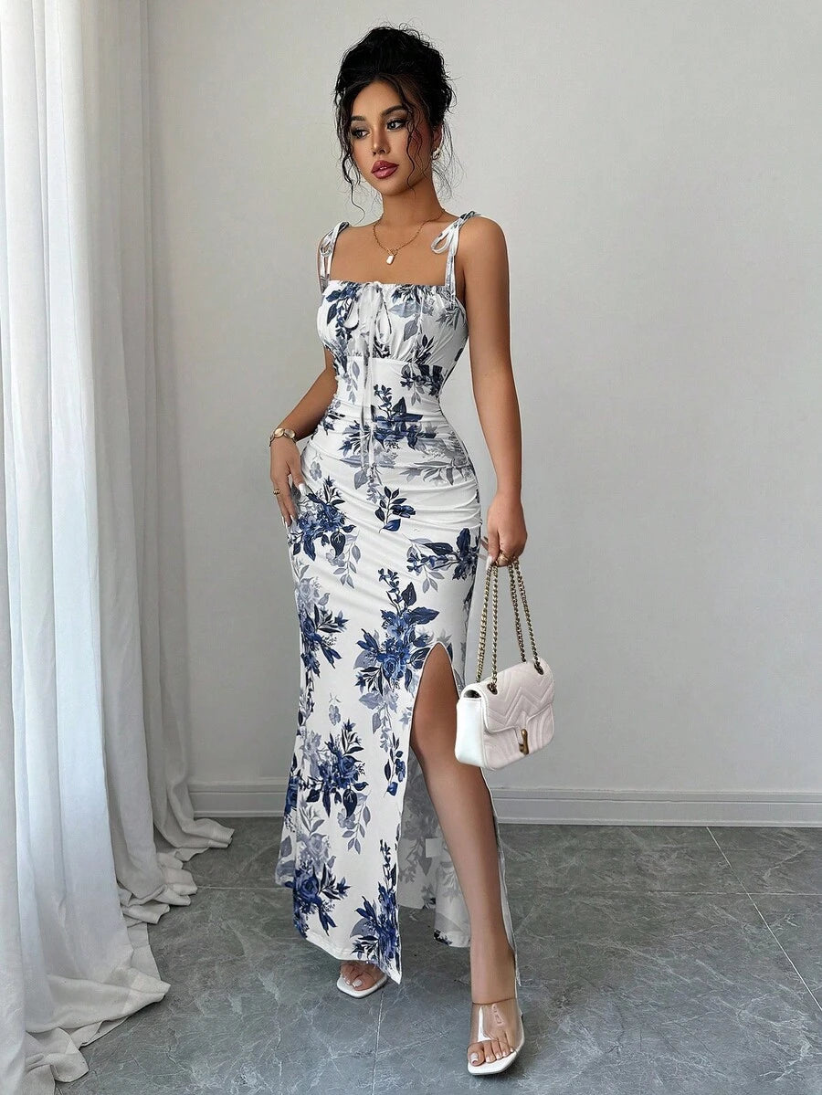 Elenzga New Women's Spaghetti Strap Tie Bow Waist Ruffle Hem Slit Design Dress, Versatile For Dates, Parties, Daily Wear, Flattering & Elegant