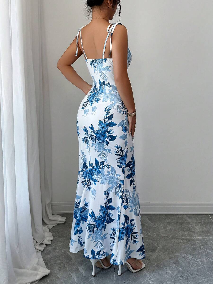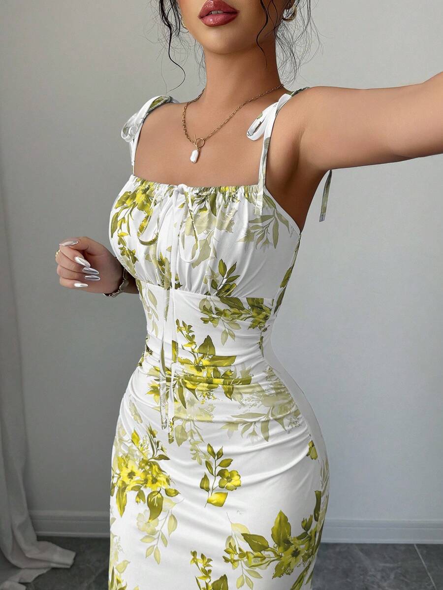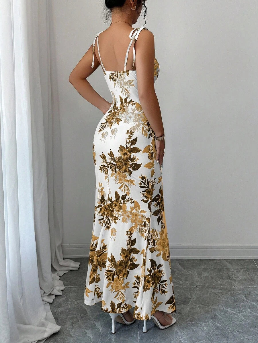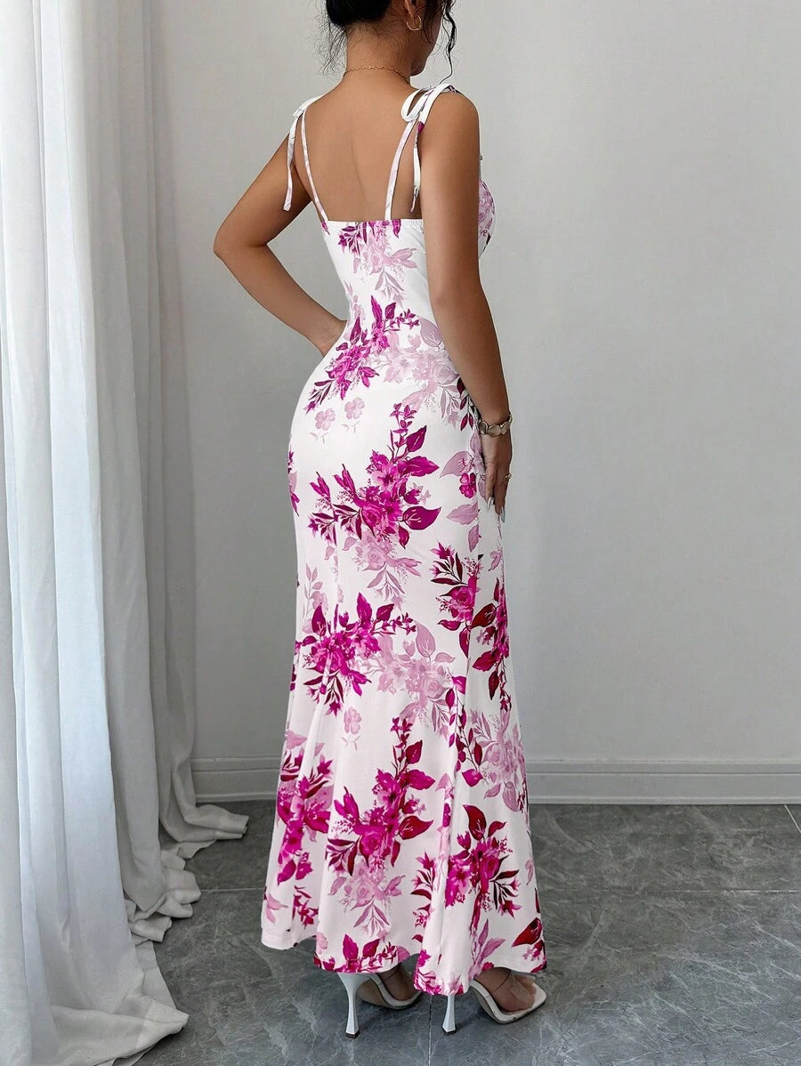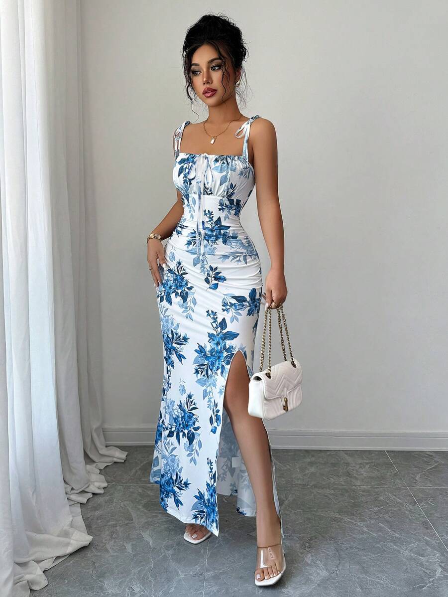 Elenzga New Women's Spaghetti Strap Tie Bow Waist Ruffle Hem Slit Design Dress, Versatile For Dates, Parties, Daily Wear, Flattering & Elegant