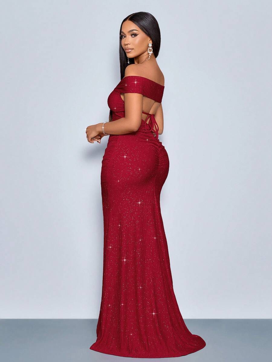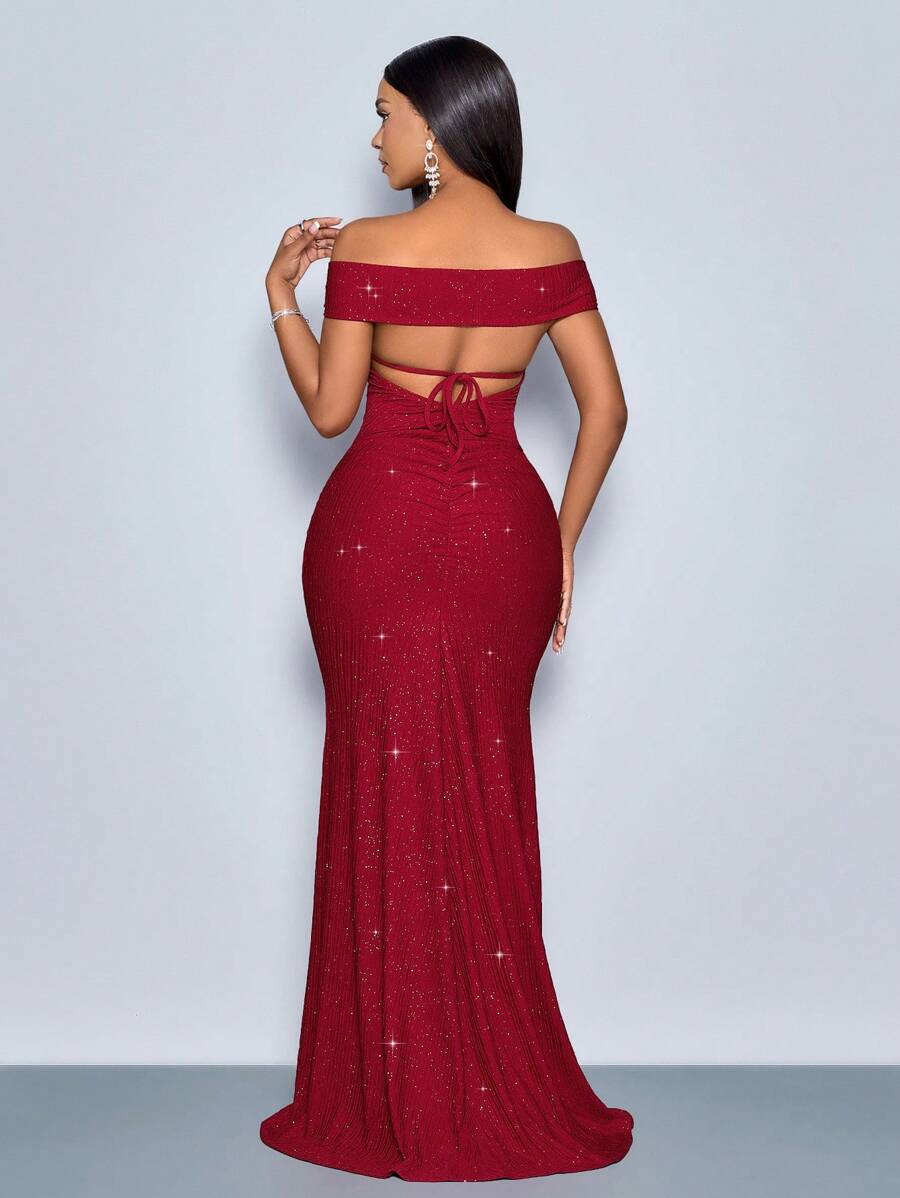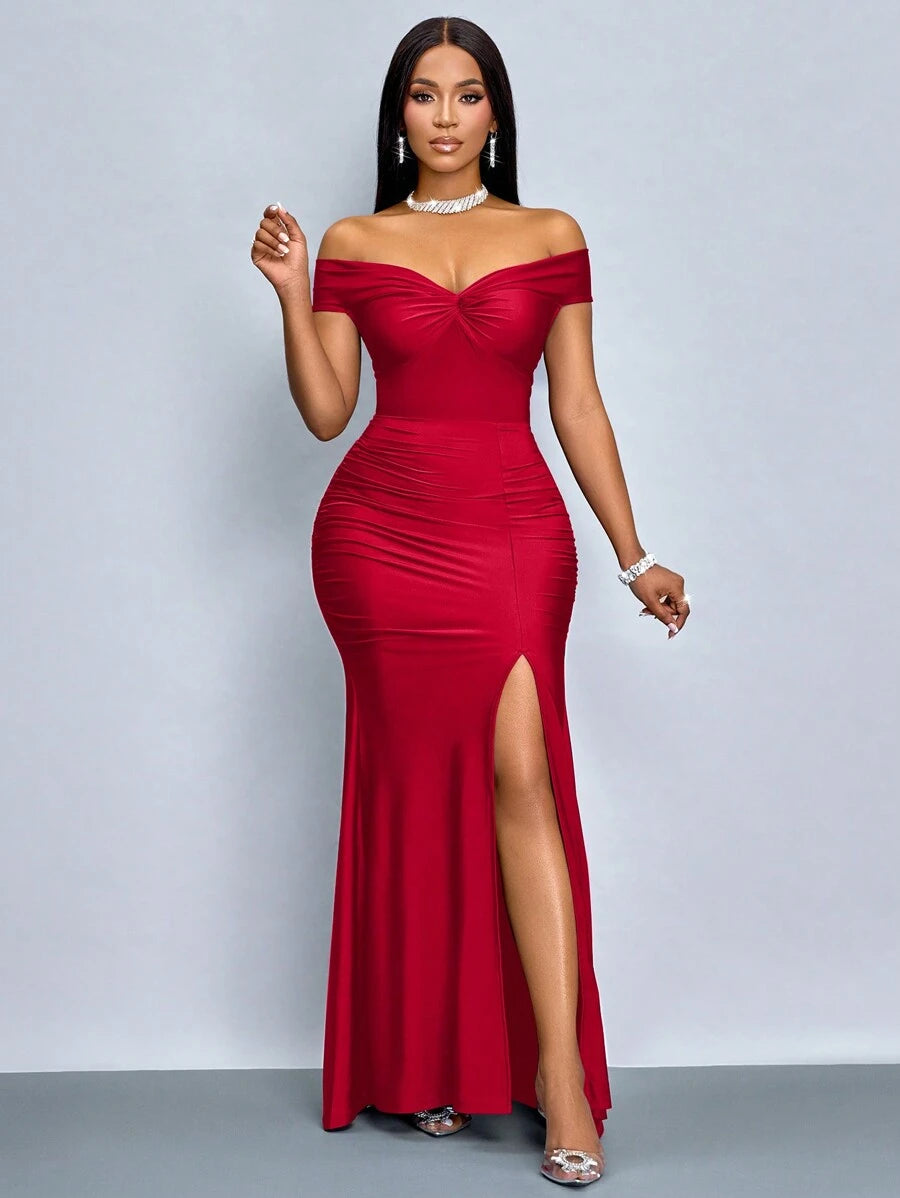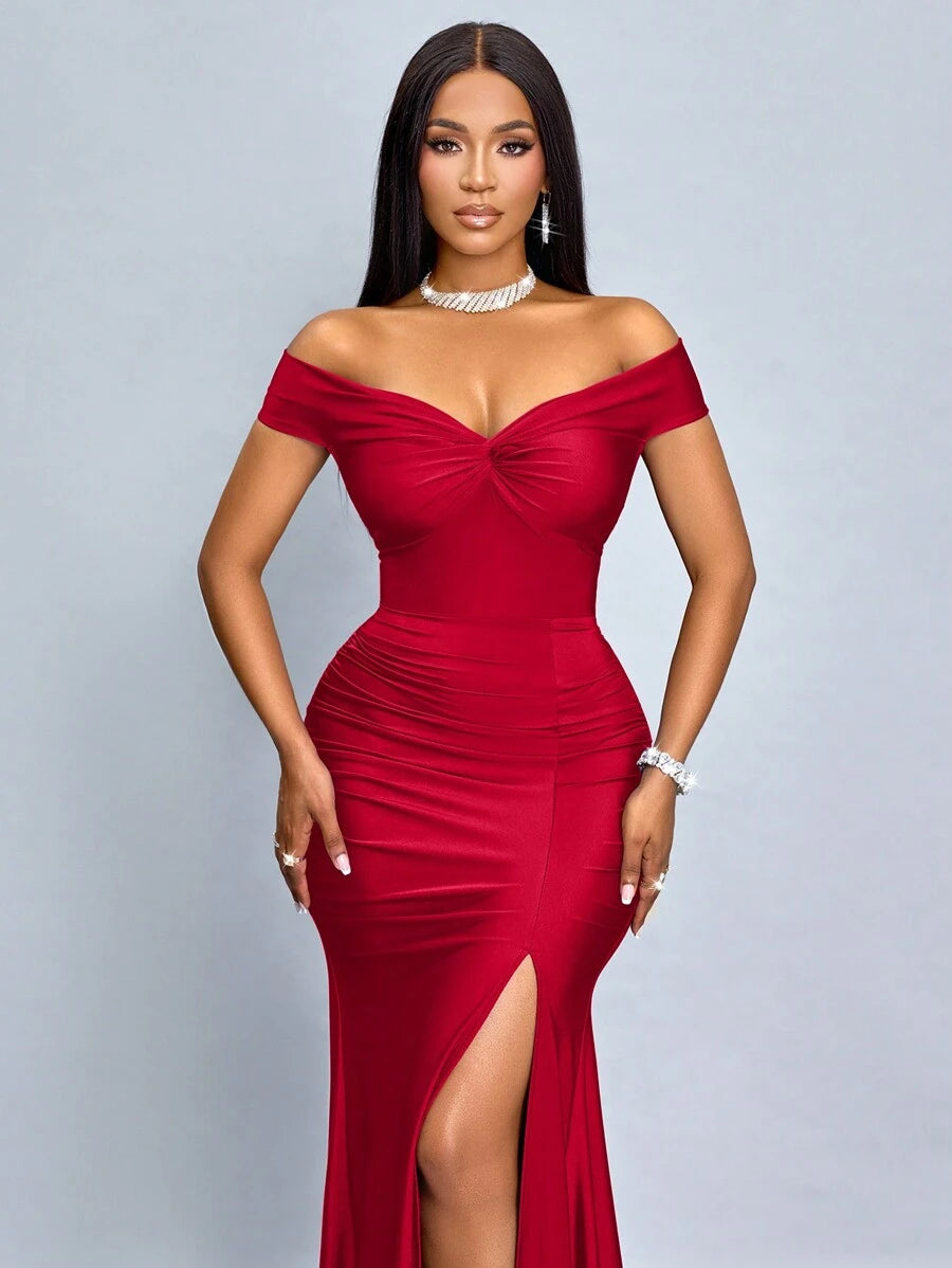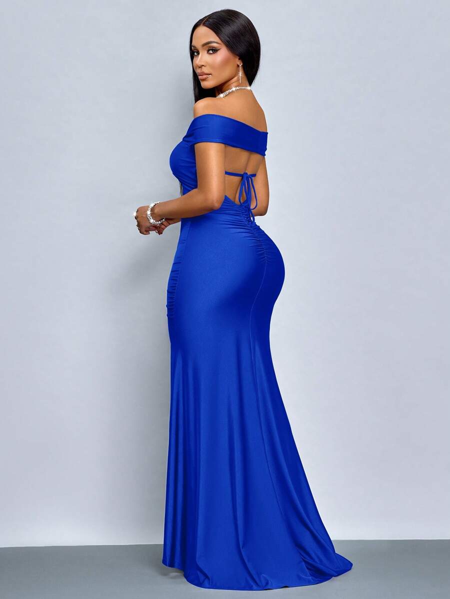 SOLERSUN Elegant Solid Color Off Shoulder Twist Cutout Back Fitted Dress