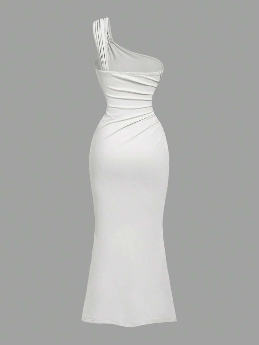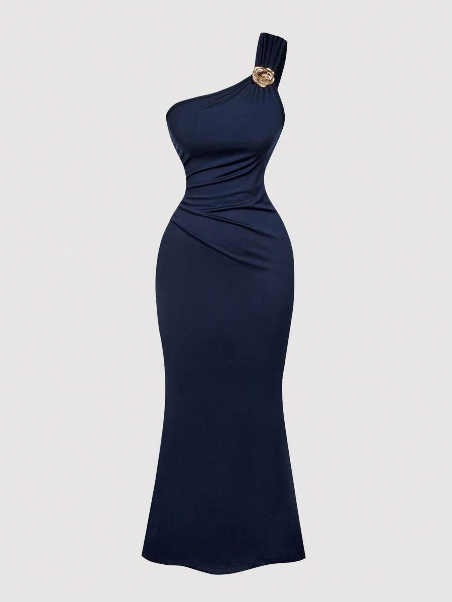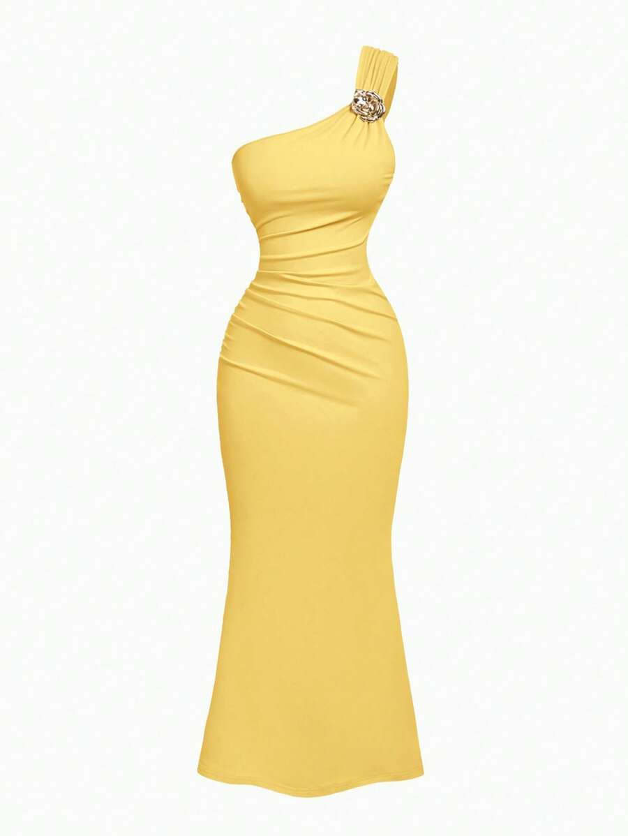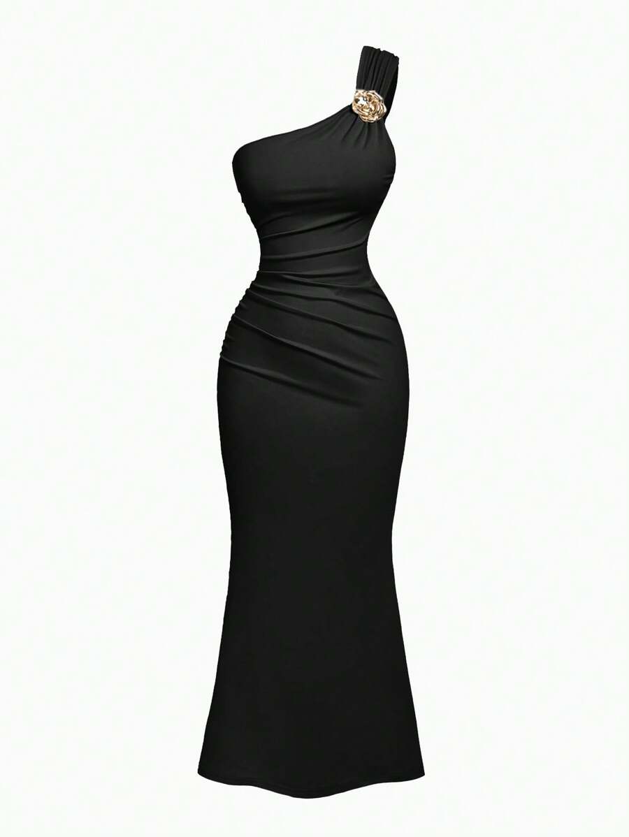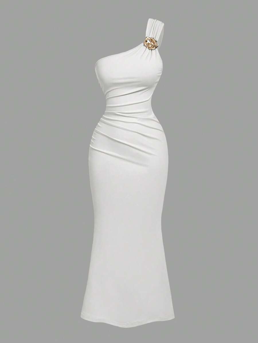 X Hannahelzahed SHEIN MOD Gold Brooch Decor Asymmetric Neck Ruched Fishtail Skirt